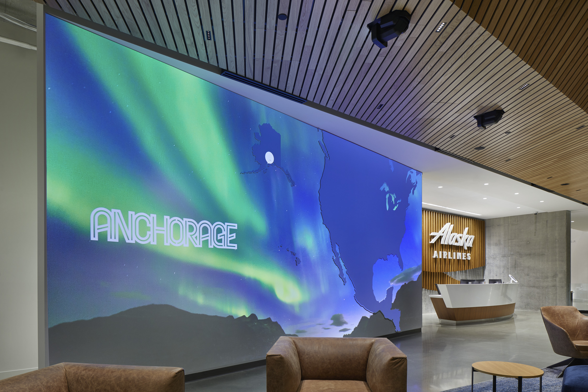 Intended to captivate audiences upon arrival, this projected wall graphic creates a vibrant, welcoming spirit for visitors to the building. The evolving and dynamic digital projection depicts the breadth and reach of Alaska’s commercial service.