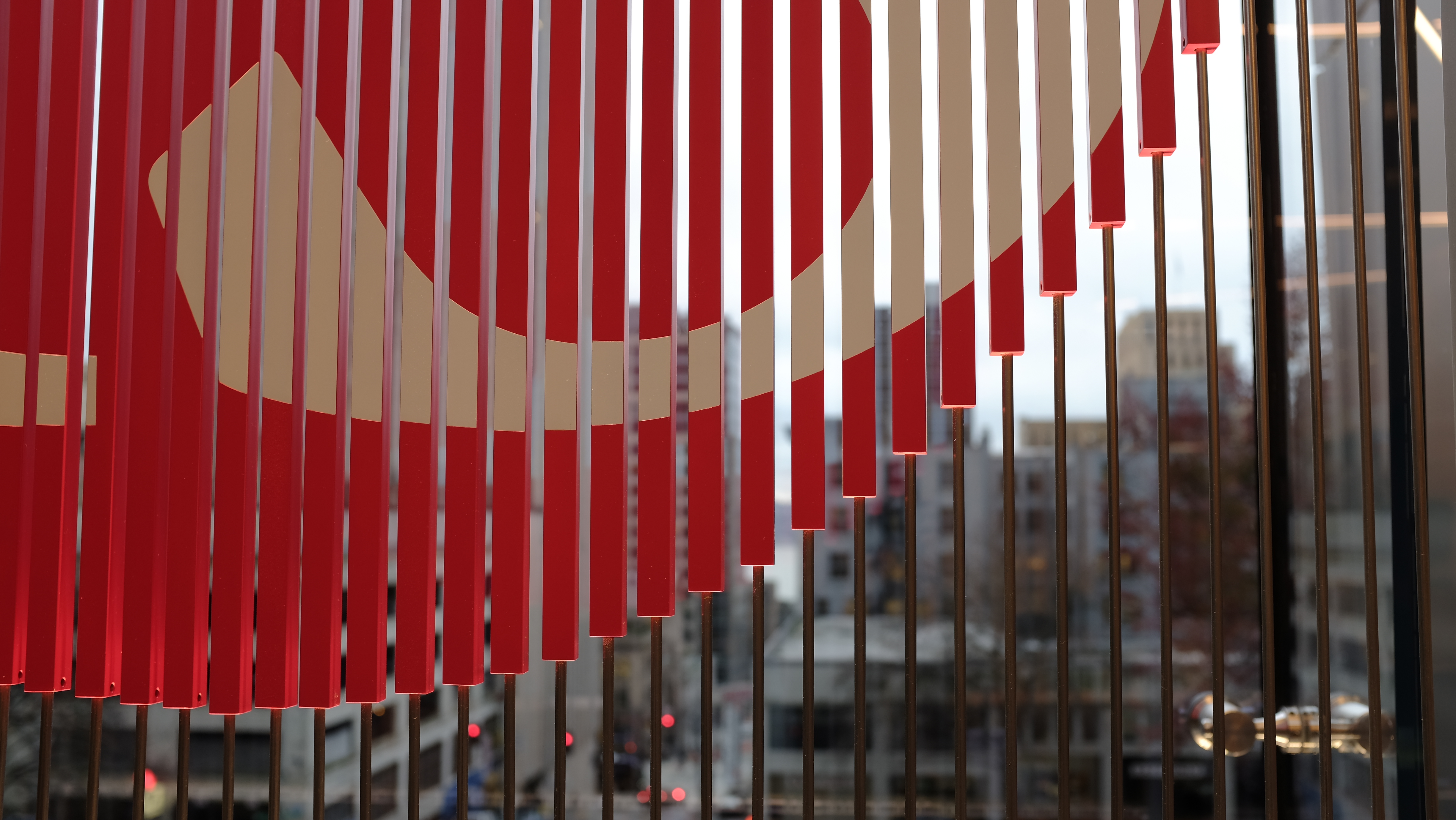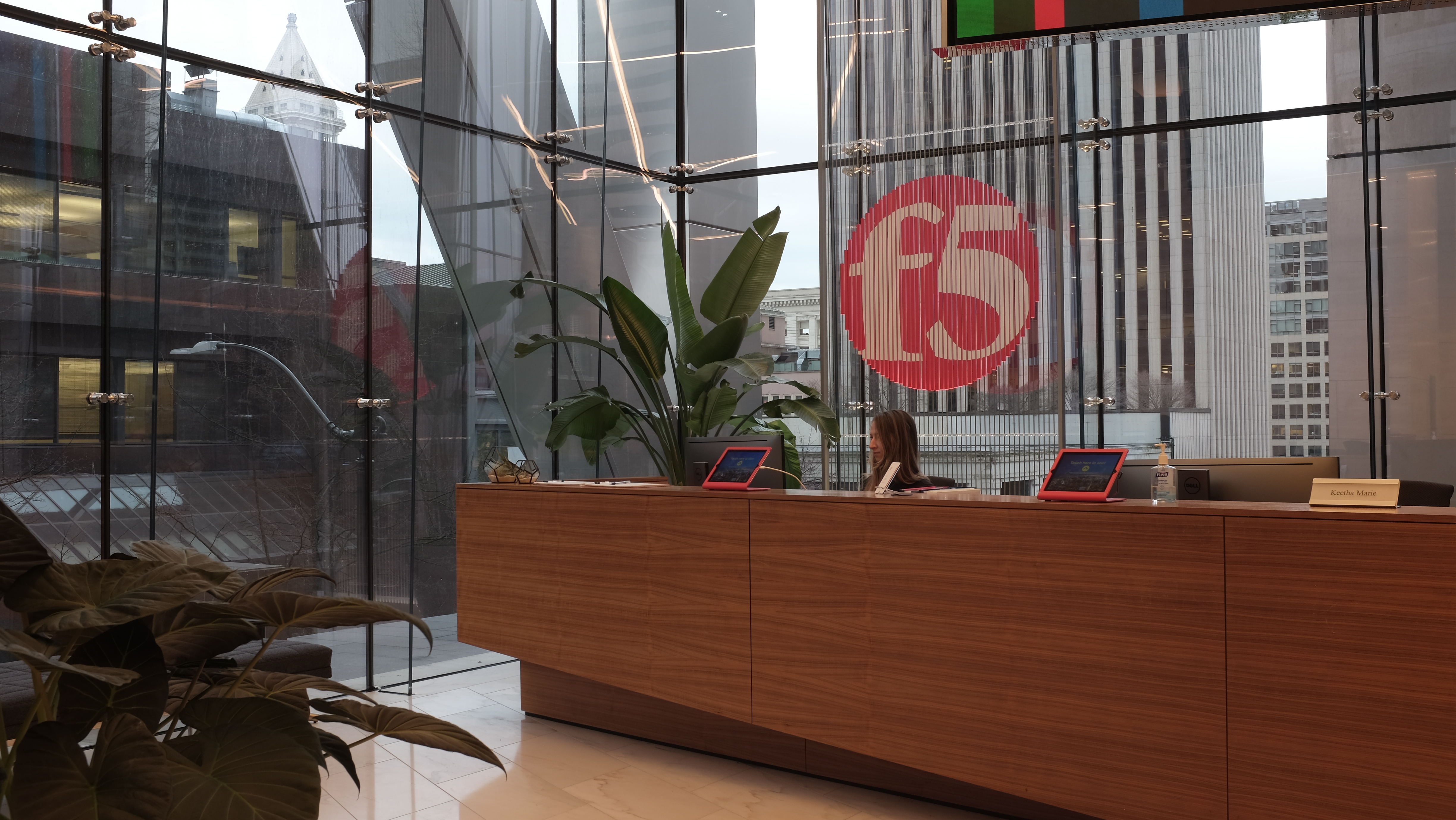 Two double-sided lobby signs face the prominent downtown streets of Seattle. The F5 logo is rendered via rectilinear tubes attached to steel rods which span the vertical length of the window bay.